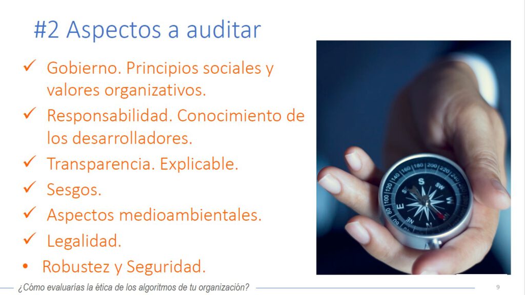 Bausá, auditora interna con formación informática, apuntó una hoja de ruta y algunas pautas prácticas para arrancar una auditoría sobre la ética de los algoritmos, empezando por elaborar un mapa o inventario de los algoritmos que utiliza la organización -identificando cuáles afectan a las personas o a la toma de decisiones con posibles implicaciones éticas- siguiendo por los aspectos relevantes a auditar como es el gobierno, la transparencia, los sesgos, la legalidad, la seguridad…
