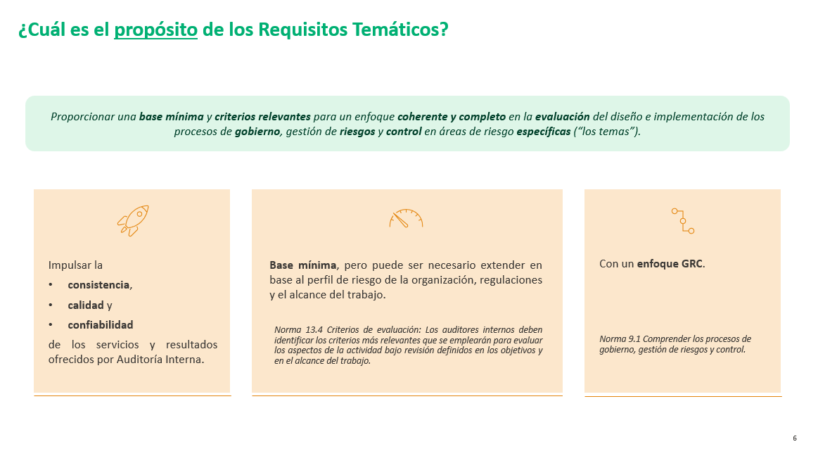 El experto ha arrancado la sesión con una introducción a los requisitos temáticos y su papel dentro del Marco Internacional para la Práctica Profesional de la Auditoría Interna, recordando que representan un nuevo componente diseñado para proporcionar una base mínima común de criterios relevantes en la evaluación de riesgos, el gobierno y los controles en áreas de riesgo específicas. Tal y como ha señalado, contribuyen a reforzar la consistencia metodológica de los trabajos de Auditoría Interna y a contar con mayor homogeneidad en la cobertura de temas transversales críticos.