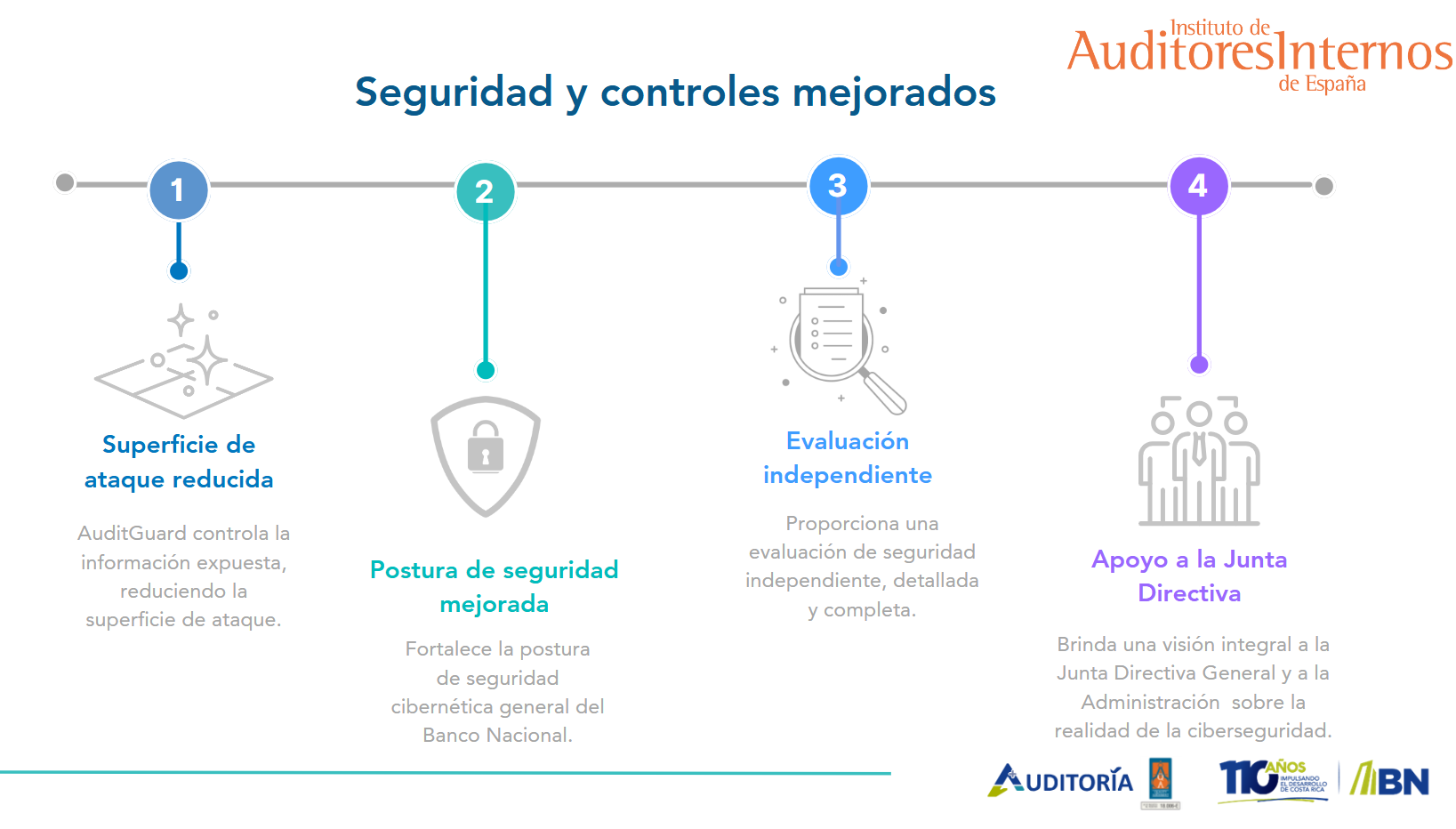 A través de la innovación y la optimización de las herramientas tecnológicas, el desarrollo de AuditGuard ha contemplado diferentes escenarios con simulacros de ataques como phishing, ramsomware, ingeniería inversa y creación de malware permitiendo a la entidad la identificación de oportunidades para mejorar la preparación y la respuesta ante los eventos cibernéticos, además de elevar los resultados del área de Auditoría General del Banco.