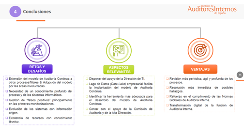 La sesión también ha incluido una explicación práctica sobre cómo la Auditoría Continua se ha integrado con las Nuevas Normas Globales de Auditoría Interna, actuando no solo como un método innovador de evaluación, sino también como evidencia de cumplimiento ante futuras revisiones de calidad de la Función de Auditoría Interna.