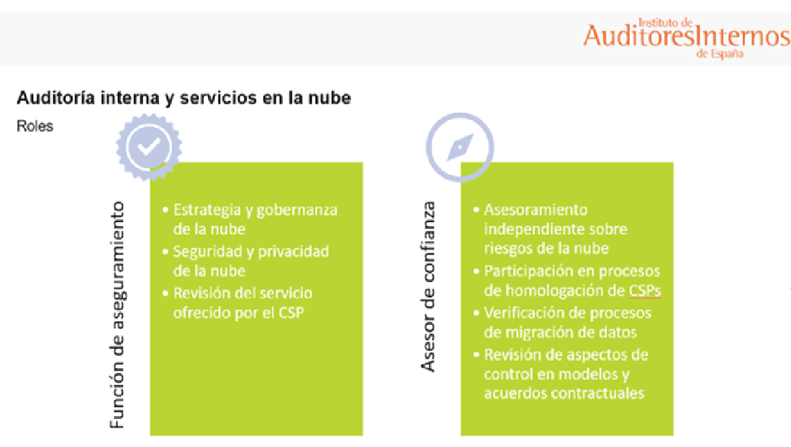 En referencia a los roles que puede desempeñar Auditoría Interna, Serra destaca que, además de su función de aseguramiento, “que implica revisar los entornos de control de los procesos organizativos que utilizan servicios en la nube, Auditoría Interna también puede y debe asumir el papel de asesor de confianza. Este rol complementario permite ofrecer opiniones y recomendaciones independientes en proyectos clave de la organización relacionados con el uso de la nube”.