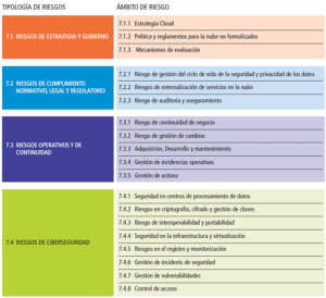 Durante su intervención, los expertos también han hecho un repaso a los riesgos más significativos que quedan recogidos en el documento y para los que, por un lado, se detalla el objetivo de control que cubriría el riesgo y, por el otro, se ofrece una descripción de como auditarlo, tanto en la parte cuya responsabilidad recae en la compañía (CSC), como en la parte en la que la responsabilidad recae en el proveedor (CSP).  Las tipologías de riesgos incluidos son: Riesgos de estrategia y Gobierno; de cumplimiento normativo, legal y regulatorio; operativos y de continuidad; así como de ciberseguridad.