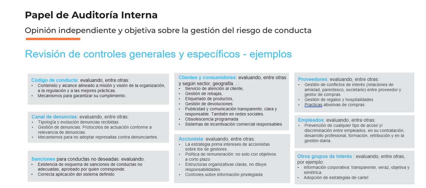 La sesión ha puesto de manifiesto cómo la gestión del riesgo de conducta es esencial para mantener la integridad y reputación de una organización. Con su trabajo, el auditor interno está contribuyendo a promover una cultura ética y de cumplimiento en la organización, así como a proteger sus intereses y reputación.