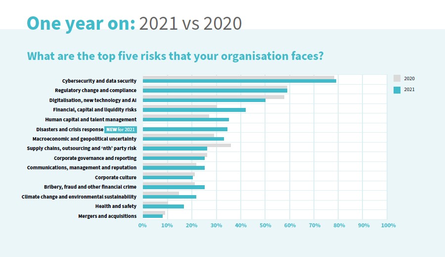 Aunque en la pandemia los reguladores y supervisores adoptaron diversas iniciativas y relajaron sus exigencias para aliviar la carga regulatoria, la normalidad regresará, y por eso, para un 59% de los encuestados, los “cambios regulatorios y compliance” siguen estando entre los principales riesgos empresariales, colocándose en el segundo lugar del ranking.