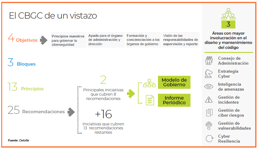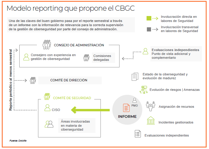 Por cada uno de esos principios, los expertos aportan una serie de recomendaciones concretas para ayudar a la organización desde un enfoque práctico. Así, por ejemplo, el número 11 (Informe Periódico) señala como una buena práctica de gobierno -según las normas internacionales-, el reporte periódico de la situación de la ciberseguridad de la organización a los órganos de gobierno. En línea con lo anterior, el código incluye la recomendación número 20 que aconseja al “órgano de administración” de llevar a cabo “un seguimiento regular de la ciberseguridad, incluyendo este tema en el orden del día de sus reuniones y/o en las de sus comisiones delegadas correspondientes donde aplique (auditoría, riesgos, sostenibilidad u otras comisiones específicas para el tratamiento del riesgo de ciberseguridad). Para ello requerirá informes periódicos de la gestión de ciberseguridad al responsable ejecutivo (director de Seguridad de la Información o CISO, por sus siglas en inglés). Este reporte deberá realizarse periódicamente, siendo una buena práctica su realización “al menos dos veces al año.”