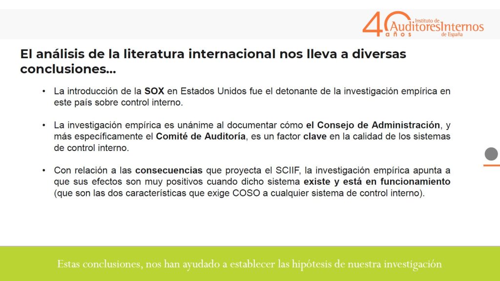 Sin embargo, tal y como ha puesto de manifiesto Fuentes durante su intervención, “es escasa la literatura empírica, nula en España, que permita identificar los factores determinantes de la calidad de los sistemas de control interno de la información financiera”. Entre las conclusiones extraídas por la experta en su fase de investigación -y que sirvieron como base de su hipótesis de investigación- ha destacado, además de la introducción de la SOX en EEUU, “la unanimidad en que el Consejo de Administración y, más concretamente, el Comité de Auditoría, es un elemento clave en la calidad de los sistemas de control interno y los efectos positivos de que exista y esté en funcionamiento el sistema de control interno, dos características que exige COSO”.