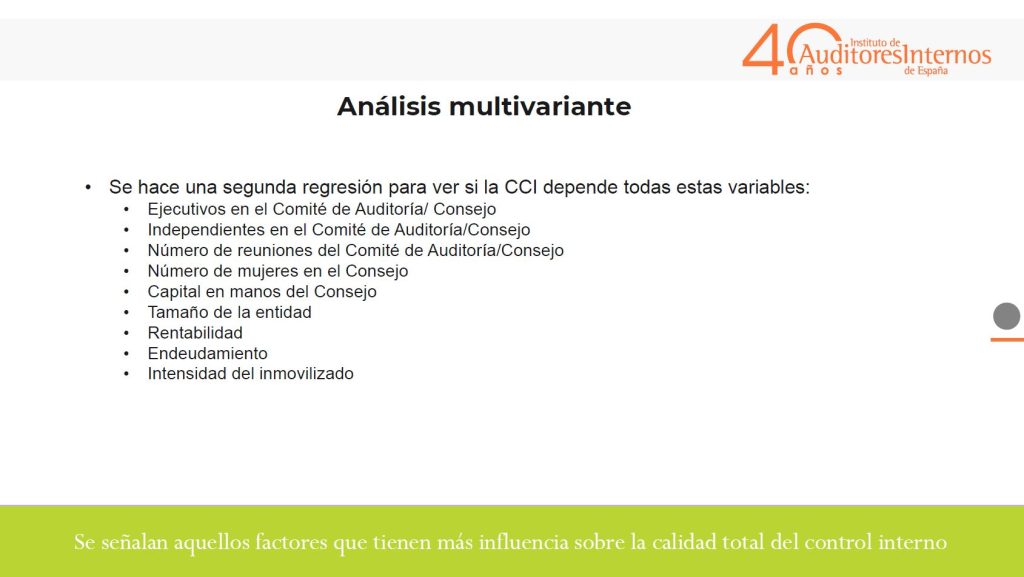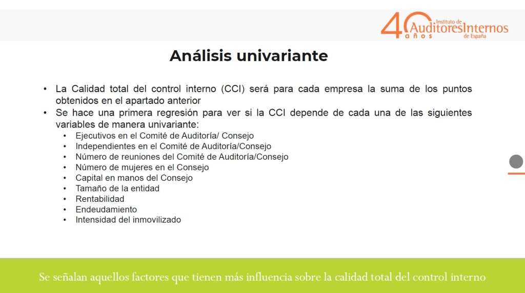 Durante su exposición, Fuentes ha desgranado cada una de las variables que se han tenido en cuenta a la hora de calificar la calidad de los controles de información financiera analizados, así como el análisis econométrico realizado tanto atendiendo a una única variable como incorporando diversas variables.
