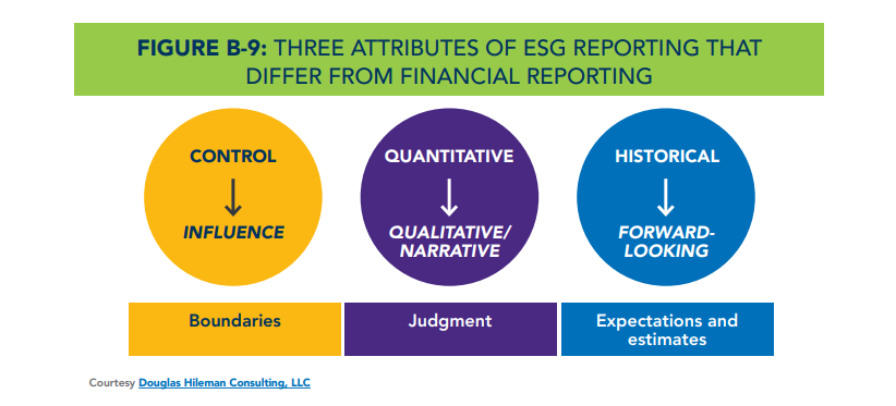 - Describe qué contiene la información de sostenibilidad/ESG (aspectos medioambientales, sociales y de gobierno) y sus diferencias con la información financiera: Control vs. Influencia; cuantitativa vs. cualitativa e histórica vs. prospectiva.