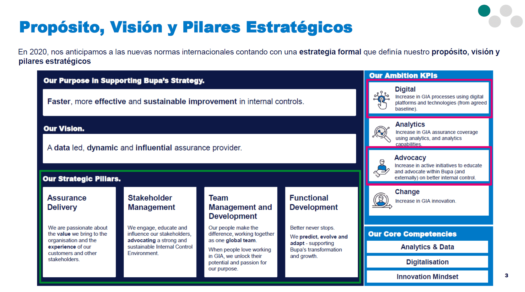 Desde el convencimiento de que Auditoría Interna debe contribuir de forma directa a la mejora del control interno y a la sostenibilidad de la organización, la función de Auditoría Interna de Satinas & Bupa cuenta con un marco estratégico articulado en torno a cuatro pilares fundamentales.