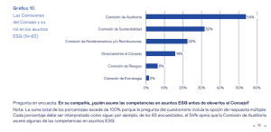 El 54% de los consejeros y miembros de las Comisiones de las principales compañías cotizadas y no cotizadas en España, considera que la Comisión de Auditoría es la principal responsable de elevar los asuntos ESG (por sus siglas en inglés, Environmental, Social y Governance) al Consejo de Administración, por delante de la Comisión de Sostenibilidad. Este es uno de los principales datos del estudio ‘El rol de la Comisión de Auditoría en asuntos ESG’, elaborado por el Centro de Gobierno Corporativo de Esade, PwC España y el Instituto de Auditores Internos de España, que analiza la opinión de más de un centenar de consejeros y tiene como objetivo identificar las necesidades actuales de las Comisiones de Auditoría para afrontar su rol esperado en materia de ESG, además de las tendencias y de los nuevos retos asociados a las mismas.