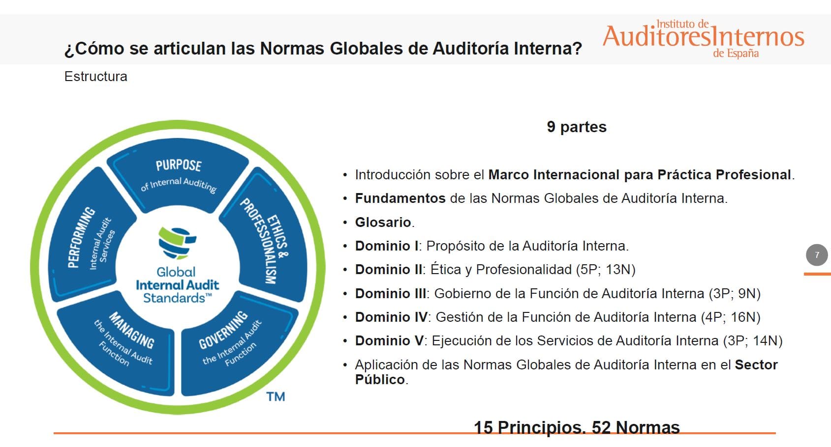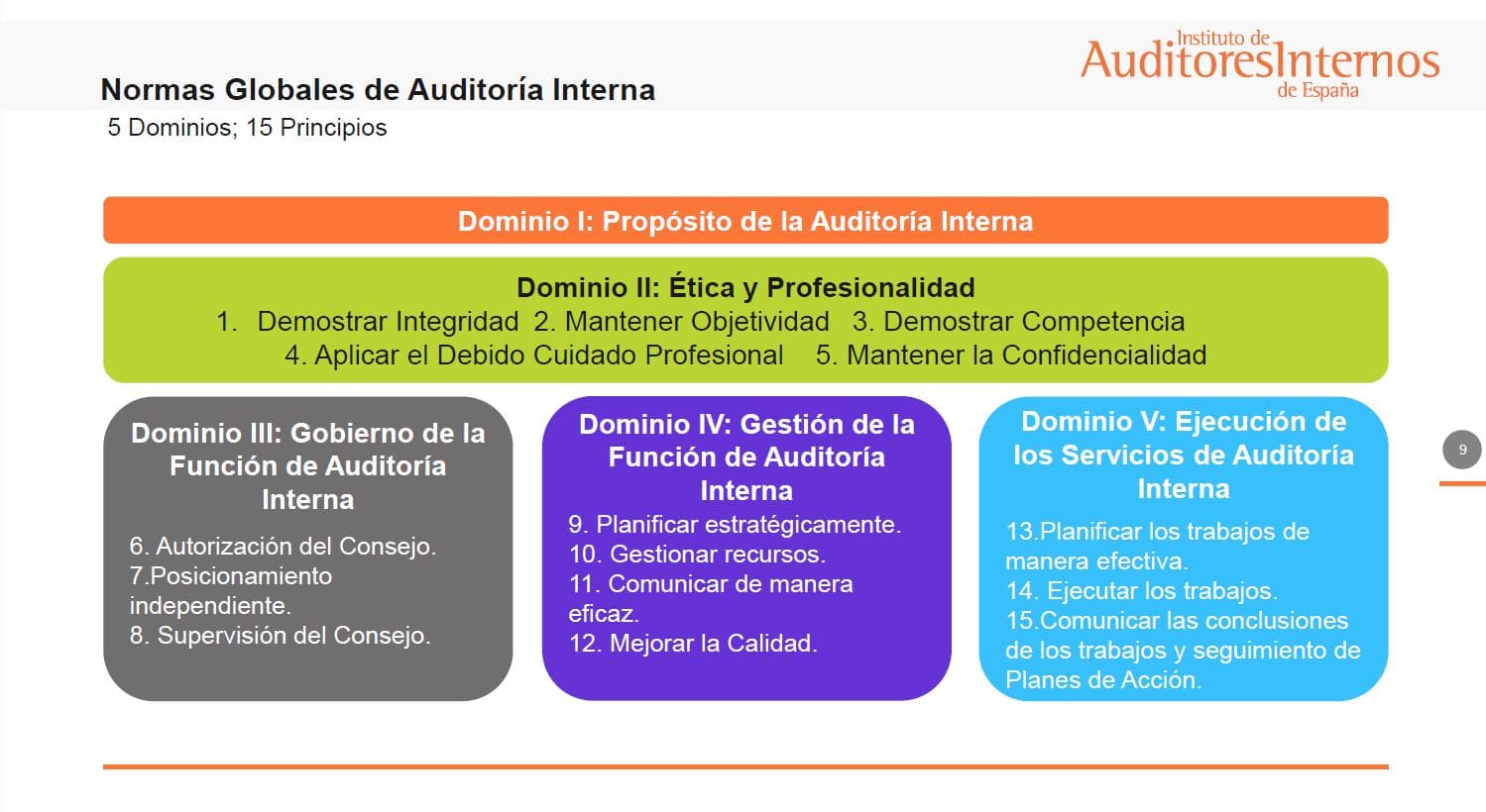 Las nuevas Normas Globales de Auditoría Interna se resumen en 5 dominios -Propósito, Ética, Gobierno, Gestión y Ejecución- y 15 principios rectores con sus respectivas normas.