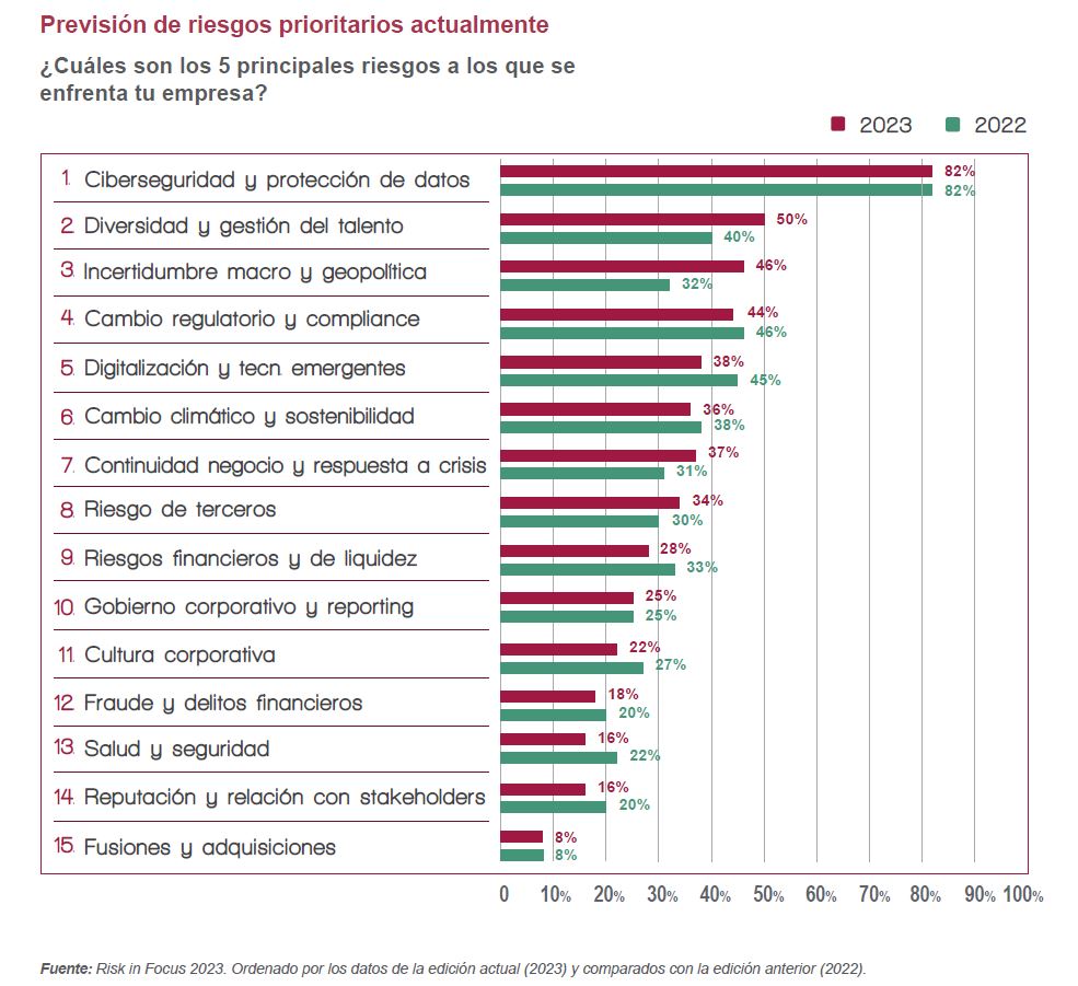 Una vez más, el ranking de los riesgos más relevantes desde la perspectiva de los auditores internos viene encabezado por ciberseguridad que, como recuerda el informe, se ha convertido en un riesgo permanente a vigilar por sus altos niveles de impacto y probabilidad.