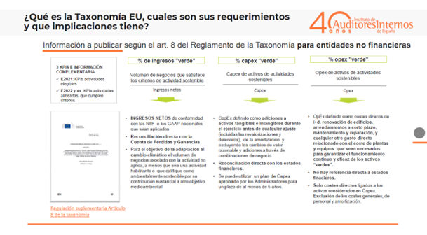 En relación con los requisitos de información, Redondo ha hecho especial énfasis en el tipo de información que deben recoger las entidades, ya que estos requisitos difieren de las compañías no financieras de las que sí los son. En el primero de los casos, deben atender a los ingresos netos, CapEx y Opex, mientras que las entidades financieras deben publicar unos KPIs adaptados a sus negocios a partir de la información que tengan de las empresas en las que intervienen, financian, gestionan o prestan servicios.