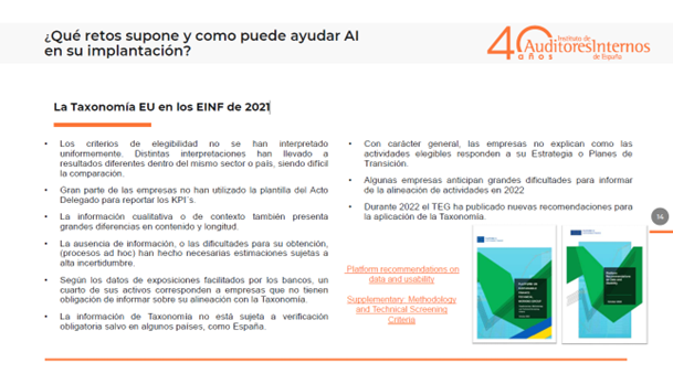La aplicación de la Taxonomía EU en los Estados de Información No Financiera de 2021 conllevó, tal y como ha remarcado Redondo, grandes retos y dificultades, entre ellos la falta de uniformidad en la interpretación de los criterios de elegibilidad; la no utilización de la plantilla del Acto Delegado para reportar los KPIs; diferencias en cuanto a tipo de contenido y extensión de la información cualitativa o de contexto; estimaciones sujetas a alta incertidumbre debido a la falta de información o la complejidad para su obtención.