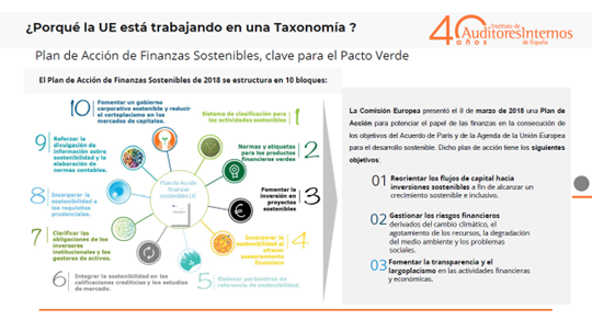 La sesión de marzo de Los Lunes del Instituto de Auditores Internos ha contado con la participación de Helena Redondo, experta en Sostenibilidad y Gobierno Corporativo que ha llevado a cabo un profundo análisis de la taxonomía europea de actividades sostenibles. Una taxonomía que, tal y como ha reflejado durante su intervención, define la hoja de ruta que “pretende transformar la Unión Europea en una sociedad más justa, próspera y sostenible” a través de tres objetivos: